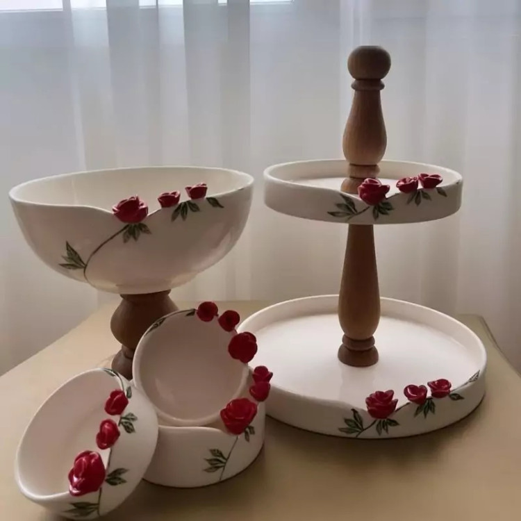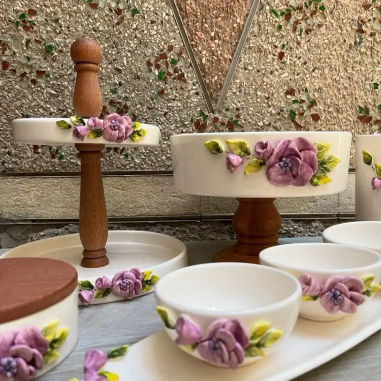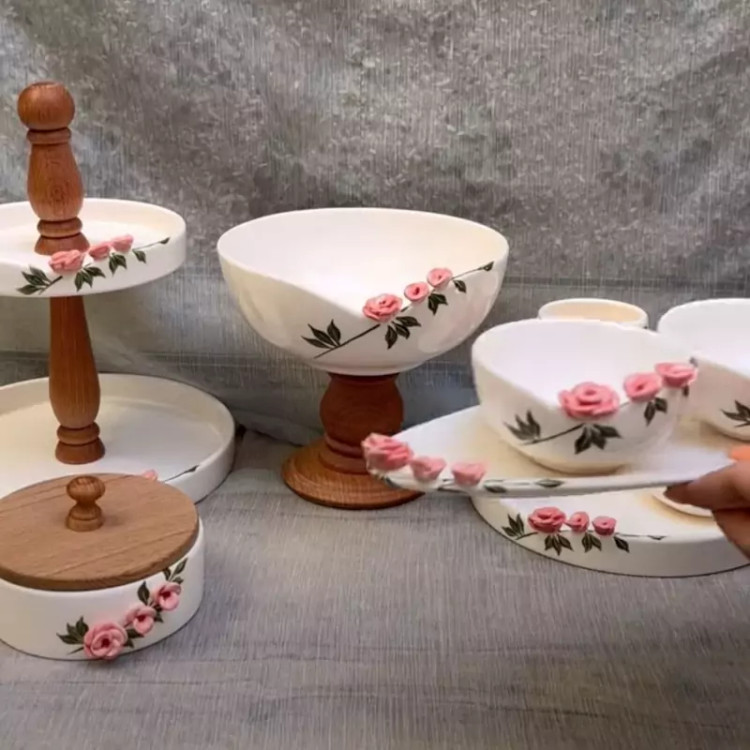 سرویس های پذیرایی گل برجسته در رنگ دلخواه اقلام قابل تغییر است شیرینی خوری دو طبقه ۹۹۰میوه خوری پایه چوبی پهن ۹۳۰کاسه های گرد کوچک 3عدد ۶۷۰ رولت خوری برای زیر سه کاسه ۶۰۰ اجیل خوری قطر 20 با درب چوبی ۵۹۰ اقلام قابل اضافه شدن یا کم شدن است بعد ثبت امکان کنسلی و مرجوعی نیست کارها دستسازن ارسال با چاپار و پرداخت هزینه درب منزل با مشتری