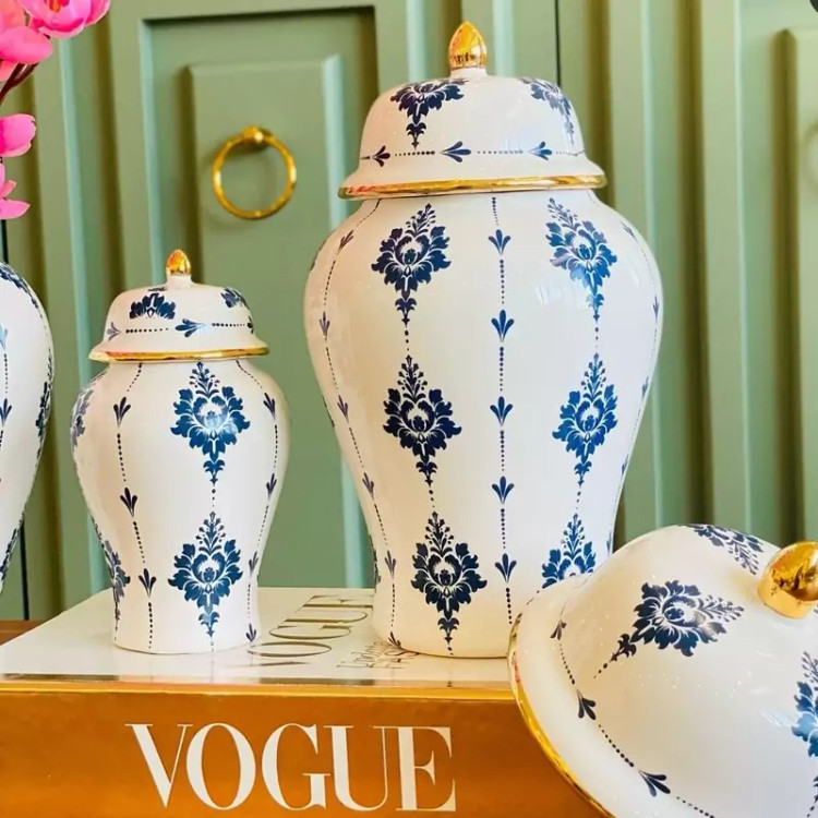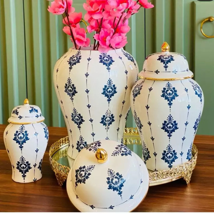 ست سه تایی جینجر جار گلدان قلم آبی سرامیکی مزین به لاستر طلا 12عیار قابل سفارش به صورت تک سایز هست ترند امسال برای روی کنسول و میز مبلمان ارسال از طریق چاپار و پرداخت هزینه ارسال درب منزل با مشتری بعد ثبت کنسلی نداریم