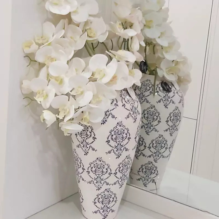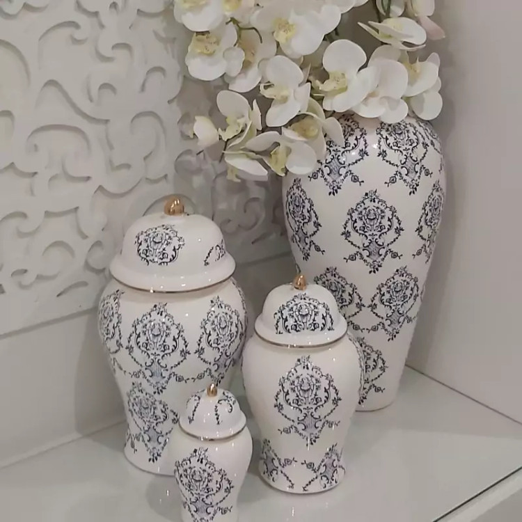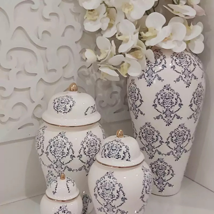 ست 3تایی جینجرجار و گلدان سایز 57سانت طرح داماس آبی لبه طلایی(پرداخت هزینه ارسال درب منزل با مشتری)